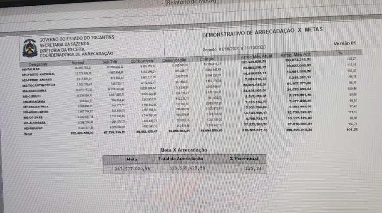 O governo fechou o mês de outubro com uma arrecadação de ICMS da ordem de R$ 310 milhões e 565 mil. O equivalente a 125,24% da meta estabelecida pela Secretaria da Fazenda para o mês, projetado em R$ 247 milhões e 977 mil.