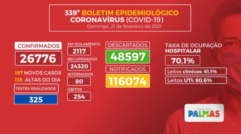 A Vigilância Epidemiológica de Palmas informa que após 343 dias de resposta, até às 09 horas do dia 21 de fevereiro de 2021, totaliza 116.074 notificações para Síndrome Gripal (SG), onde também estão incluídos os casos suspeitos para Covid-19. Destes, 48.597 descartados e 26.776 casos confirmados (números acumulados) para a doença.