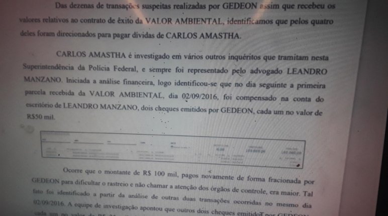 Aduz a petição da Polícia Federal: “Das dezenas de transações suspeitas realizada por Gedeon (advogado) assim que recebeu os valores relativos ao contrato de êxito da VALOR AMBIENTAL identificamos que pelo menos quatro deles foram direcionados para pagar dívida de CARLOS AMASTHA”.